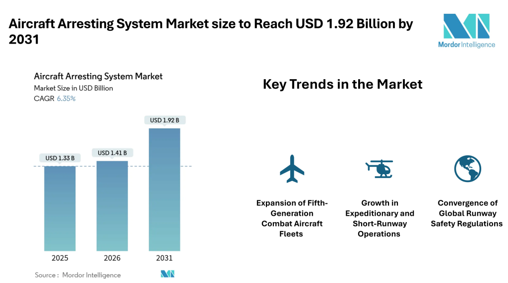 According to Mordor Intelligence, the aircraft arresting system market size was valued at USD 1.41 billion in 2026 and reach USD 1.92 billion by 2031, registering a CAGR of 6.35% during the forecast period. The aircraft arresting system market size is supported by rising investments in advanced fighter aircraft, aircraft carrier modernization programs, and stricter runway safety requirements across commercial airports.