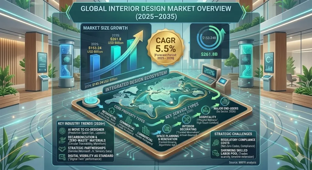 According to a comprehensive analysis by Market Research Future, the global interior design market was valued at USD 145.24 billion in 2024 and is projected to reach USD 261.8 billion by 2035, expanding at a compound annual growth rate (CAGR) of 5.5% over the forecast period 2025–2035. This near-doubling of market value reflects a profound shift in how individuals, businesses, and institutions view the spaces they occupy — and the growing willingness to invest meaningfully in them.