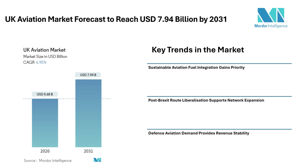 According to Mordor Intelligence, the UK aviation market size was valued at USD 5.68 billion in 2026 to USD 7.94 billion by 2031, reflecting a CAGR of 6.95% during the forecast period. This outlook underlines a balanced recovery supported by civil aviation demand, government defence spending, and policy-driven sustainability goals.